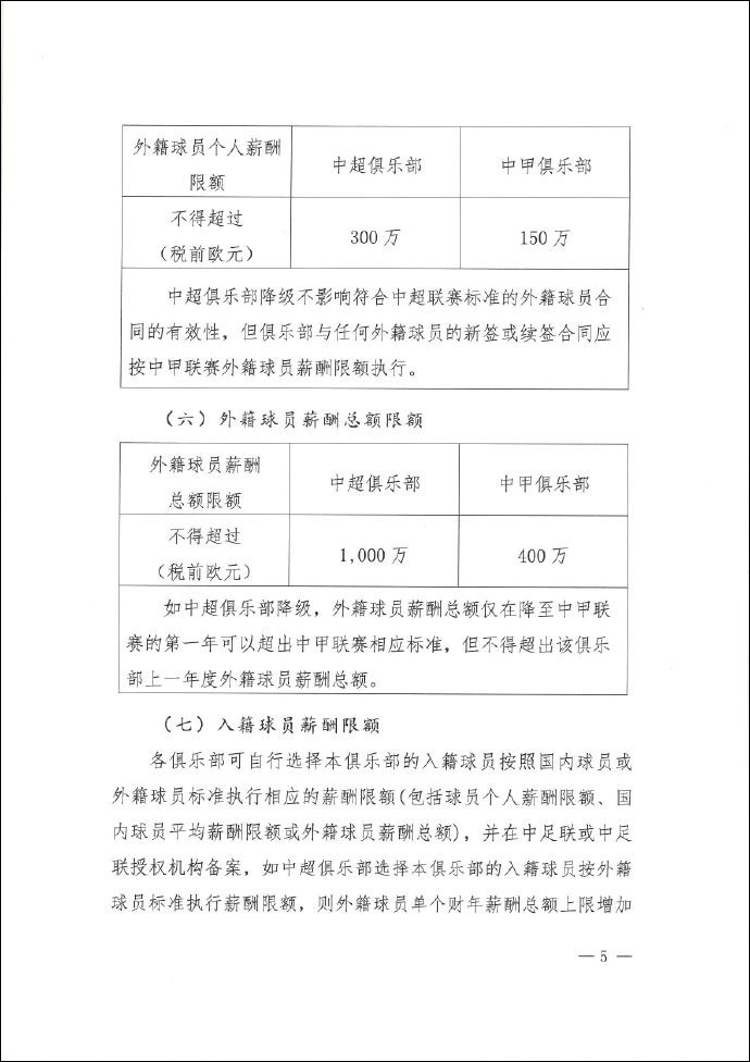 中超俱乐部外援个人薪酬不得超过300万欧元(税前),中甲俱乐部外援个人薪酬不得超过150万欧元(税前)。