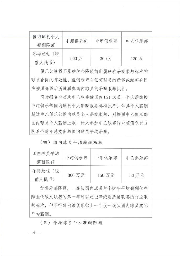 中超俱乐部国内球员个人薪酬不得超过500万元(税前),中甲国内球员个人薪酬不得超过300万元(税前),中乙国内球员个人薪酬不得超过120万。